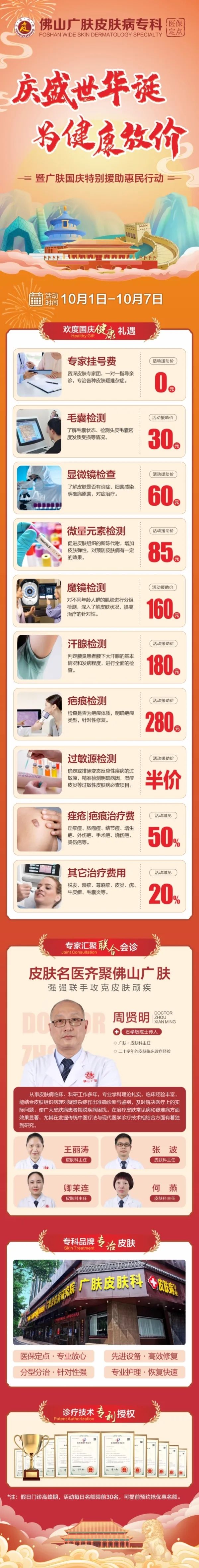 国庆通知:为方便节日期间有就诊需求的朋友,广肤皮肤科国庆不放假。医生1v1,名额有限,提前预约,凭号来院,领取援助福利吧!